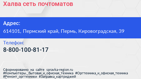 Халва, сеть почтоматов по адресу 614101, Пермский край, Пермь, Кировоградская, 39 в дальнейшем Организация, размещена в следующих категориях:
