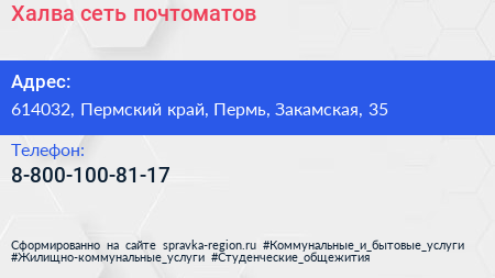Халва, сеть почтоматов по адресу 614032, Пермский край, Пермь, Закамская, 35 в дальнейшем Организация, размещена в следующих категориях: