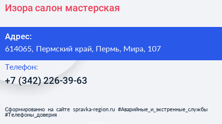 Изора, салон-мастерская по адресу 614065, Пермский край, Пермь, Мира, 107 в дальнейшем Организация, размещена в следующих категориях: