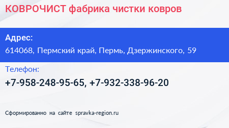 КОВРОЧИСТ, фабрика чистки ковров по адресу 614068, Пермский край, Пермь, Дзержинского, 59 в дальнейшем Организация, размещена в следующих категориях: