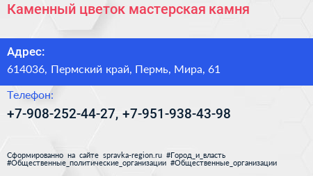 Каменный цветок, мастерская камня по адресу 614036, Пермский край, Пермь, Мира, 61 в дальнейшем Организация, размещена в следующих категориях: