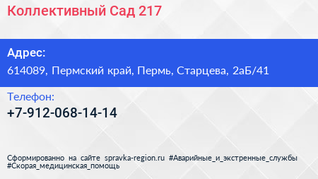 Коллективный Сад 217 по адресу 614089, Пермский край, Пермь, Старцева, 2аБ/41 в дальнейшем Организация, размещена в следующих категориях: