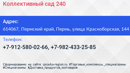 Коллективный сад №240 по адресу 614067, Пермский край, Пермь, улица Красноборская, 144 в дальнейшем Организация, размещена в следующих категориях: