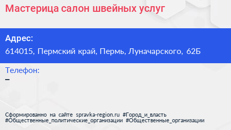 Мастерица, салон швейных услуг по адресу 614015, Пермский край, Пермь, Луначарского, 62Б в дальнейшем Организация, размещена в следующих категориях:
