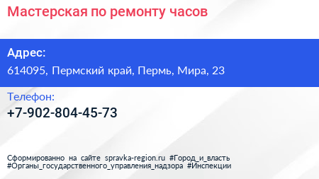 Мастерская по ремонту часов по адресу 614095, Пермский край, Пермь, Мира, 23 в дальнейшем Организация, размещена в следующих категориях: