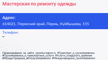 Мастерская по ремонту одежды по адресу 614021, Пермский край, Пермь, Куйбышева, 155 в дальнейшем Организация, размещена в следующих категориях: