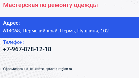 Мастерская по ремонту одежды по адресу 614068, Пермский край, Пермь, Пушкина, 102 в дальнейшем Организация, размещена в следующих категориях: