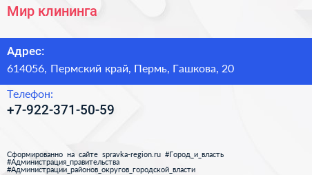 Мир клининга по адресу 614056, Пермский край, Пермь, Гашкова, 20 в дальнейшем Организация, размещена в следующих категориях: