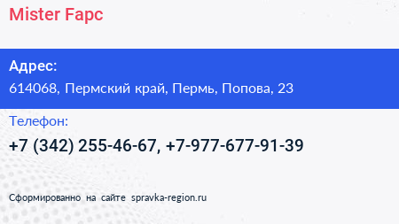 Mister Fapc по адресу 614068, Пермский край, Пермь, Попова, 23 в дальнейшем Организация, размещена в следующих категориях:
