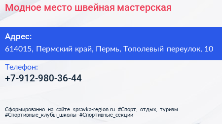 Модное место, швейная мастерская по адресу 614015, Пермский край, Пермь, Тополевый переулок, 10 в дальнейшем Организация, размещена в следующих категориях: