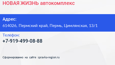 НОВАЯ ЖИЗНЬ, автокомплекс по адресу 614026, Пермский край, Пермь, Цимлянская, 13/1 в дальнейшем Организация, размещена в следующих категориях: