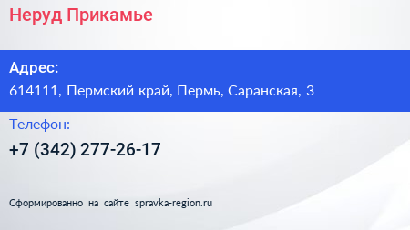 Неруд-Прикамье по адресу 614111, Пермский край, Пермь, Саранская, 3 в дальнейшем Организация, размещена в следующих категориях: