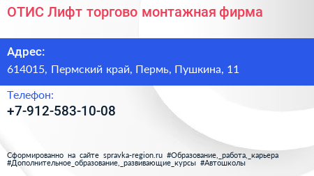 ОТИС Лифт, торгово-монтажная фирма по адресу 614015, Пермский край, Пермь, Пушкина, 11 в дальнейшем Организация, размещена в следующих категориях: