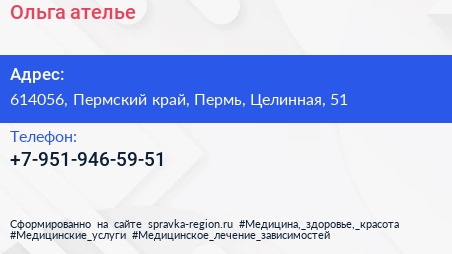 Ольга, ателье по адресу 614056, Пермский край, Пермь, Целинная, 51 в дальнейшем Организация, размещена в следующих категориях: