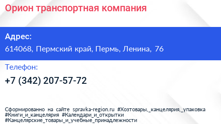 Орион, транспортная компания по адресу 614068, Пермский край, Пермь, Ленина, 76 в дальнейшем Организация, размещена в следующих категориях: