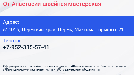 От Анастасии, швейная мастерская по адресу 614015, Пермский край, Пермь, Максима Горького, 21 в дальнейшем Организация, размещена в следующих категориях: