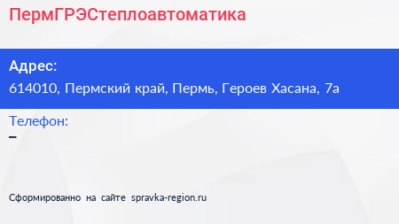 ПермГРЭСтеплоавтоматика по адресу 614010, Пермский край, Пермь, Героев Хасана, 7а в дальнейшем Организация, размещена в следующих категориях: