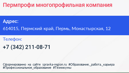 Пермпрофи, многопрофильная компания по адресу 614015, Пермский край, Пермь, Монастырская, 12 в дальнейшем Организация, размещена в следующих категориях: