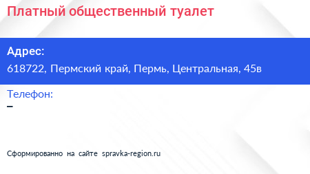 Платный общественный туалет по адресу 618722, Пермский край, Пермь, Центральная, 45в в дальнейшем Организация, размещена в следующих категориях: