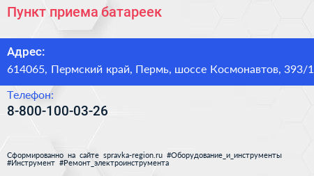 Пункт приема батареек по адресу 614065, Пермский край, Пермь, шоссе Космонавтов, 393/1 в дальнейшем Организация, размещена в следующих категориях:
