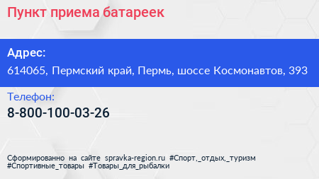 Пункт приема батареек по адресу 614065, Пермский край, Пермь, шоссе Космонавтов, 393 в дальнейшем Организация, размещена в следующих категориях: