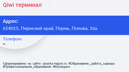 Qiwi, терминал по адресу 614015, Пермский край, Пермь, Попова, 16а в дальнейшем Организация, размещена в следующих категориях: