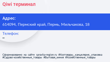Qiwi, терминал по адресу 614094, Пермский край, Пермь, Мильчакова, 18 в дальнейшем Организация, размещена в следующих категориях: