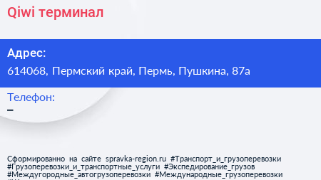 Qiwi, терминал по адресу 614068, Пермский край, Пермь, Пушкина, 87а в дальнейшем Организация, размещена в следующих категориях: