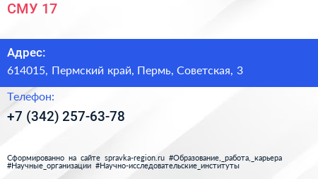 СМУ-17 по адресу 614015, Пермский край, Пермь, Советская, 3 в дальнейшем Организация, размещена в следующих категориях: