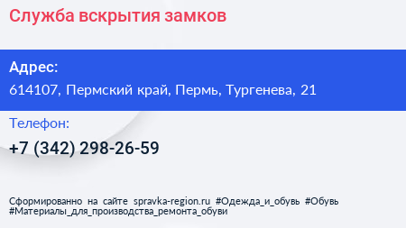 Служба вскрытия замков по адресу 614107, Пермский край, Пермь, Тургенева, 21 в дальнейшем Организация, размещена в следующих категориях: