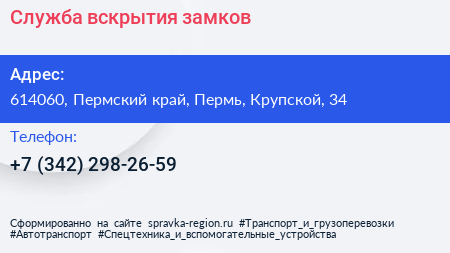 Служба вскрытия замков по адресу 614060, Пермский край, Пермь, Крупской, 34 в дальнейшем Организация, размещена в следующих категориях: