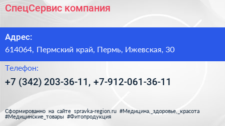 СпецСервис, компания по адресу 614064, Пермский край, Пермь, Ижевская, 30 в дальнейшем Организация, размещена в следующих категориях: