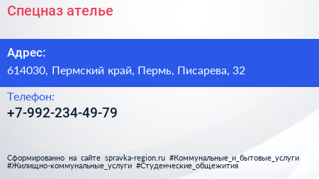 Спецназ, ателье по адресу 614030, Пермский край, Пермь, Писарева, 32 в дальнейшем Организация, размещена в следующих категориях: