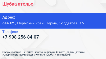 Шубка, ателье по адресу 614021, Пермский край, Пермь, Солдатова, 16 в дальнейшем Организация, размещена в следующих категориях:
