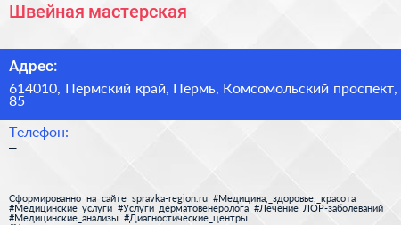 Швейная мастерская по адресу 614010, Пермский край, Пермь, Комсомольский проспект, 85 в дальнейшем Организация, размещена в следующих категориях: