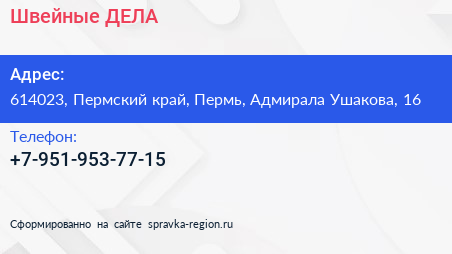 Швейные ДЕЛА по адресу 614023, Пермский край, Пермь, Адмирала Ушакова, 16 в дальнейшем Организация, размещена в следующих категориях: