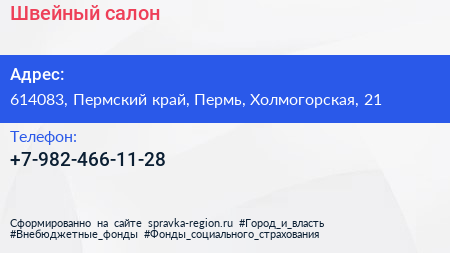 Швейный салон по адресу 614083, Пермский край, Пермь, Холмогорская, 21 в дальнейшем Организация, размещена в следующих категориях: