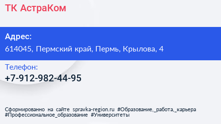 ТК АстраКом по адресу 614045, Пермский край, Пермь, Крылова, 4 в дальнейшем Организация, размещена в следующих категориях: