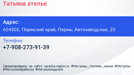 Татьяна, ателье по адресу 614101, Пермский край, Пермь, Автозаводская, 23 в дальнейшем Организация, размещена в следующих категориях: