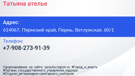 Татьяна, ателье по адресу 614067, Пермский край, Пермь, Ветлужская, 60/1 в дальнейшем Организация, размещена в следующих категориях:
