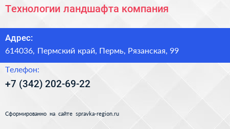 Технологии ландшафта, компания по адресу 614036, Пермский край, Пермь, Рязанская, 99 в дальнейшем Организация, размещена в следующих категориях: