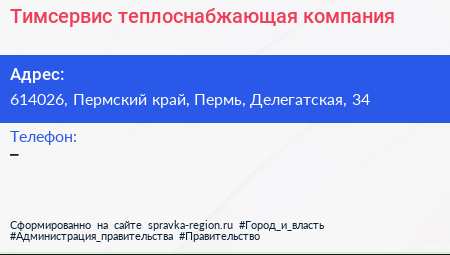 Тимсервис, теплоснабжающая компания по адресу 614026, Пермский край, Пермь, Делегатская, 34 в дальнейшем Организация, размещена в следующих категориях: