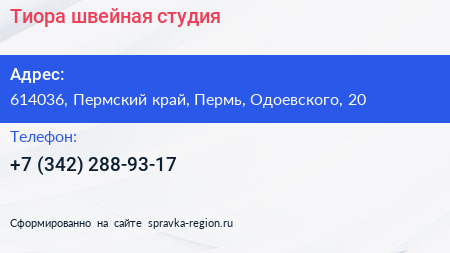 Тиора, швейная студия по адресу 614036, Пермский край, Пермь, Одоевского, 20 в дальнейшем Организация, размещена в следующих категориях: