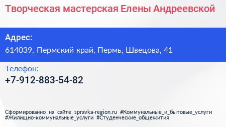 Творческая мастерская Елены Андреевской по адресу 614039, Пермский край, Пермь, Швецова, 41 в дальнейшем Организация, размещена в следующих категориях: