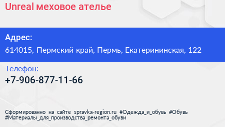 Unreal, меховое ателье по адресу 614015, Пермский край, Пермь, Екатерининская, 122 в дальнейшем Организация, размещена в следующих категориях: