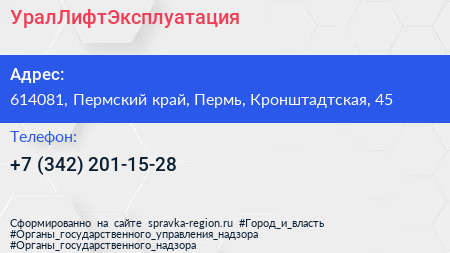 УралЛифтЭксплуатация по адресу 614081, Пермский край, Пермь, Кронштадтская, 45 в дальнейшем Организация, размещена в следующих категориях: