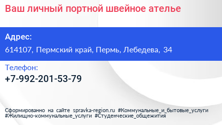 Ваш личный портной, швейное ателье по адресу 614107, Пермский край, Пермь, Лебедева, 34 в дальнейшем Организация, размещена в следующих категориях: