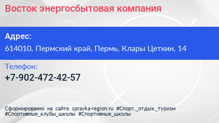 Восток, энергосбытовая компания по адресу 614010, Пермский край, Пермь, Клары Цеткин, 14 в дальнейшем Организация, размещена в следующих категориях: