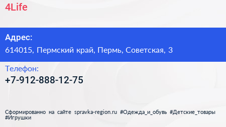 4Life по адресу 614015, Пермский край, Пермь, Советская, 3 в дальнейшем Организация, размещена в следующих категориях: