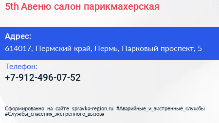 5th Авеню, салон-парикмахерская по адресу 614017, Пермский край, Пермь, Парковый проспект, 5 в дальнейшем Организация, размещена в следующих категориях: